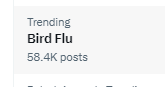 12. Back up from its 58k low, to 59k on the official X bird flu trends, which are obviously "adjusted" #birdflu #birdfluscam #birdflucensorship