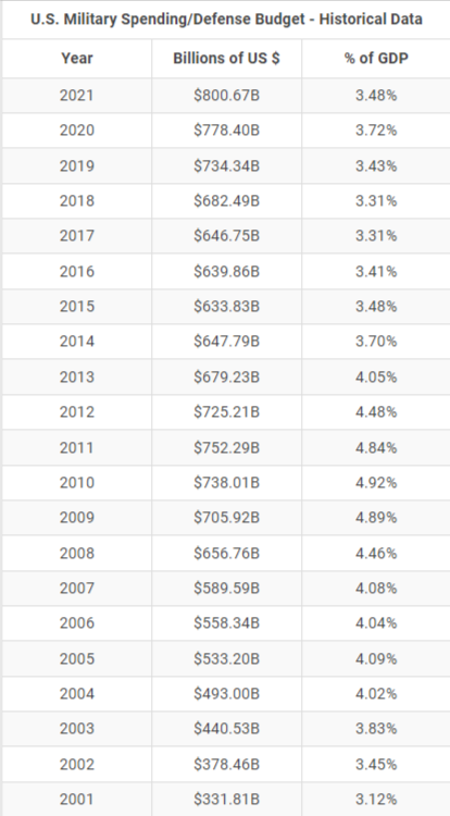Within the last 20 years, the US has spent half of its defense budget on wars.