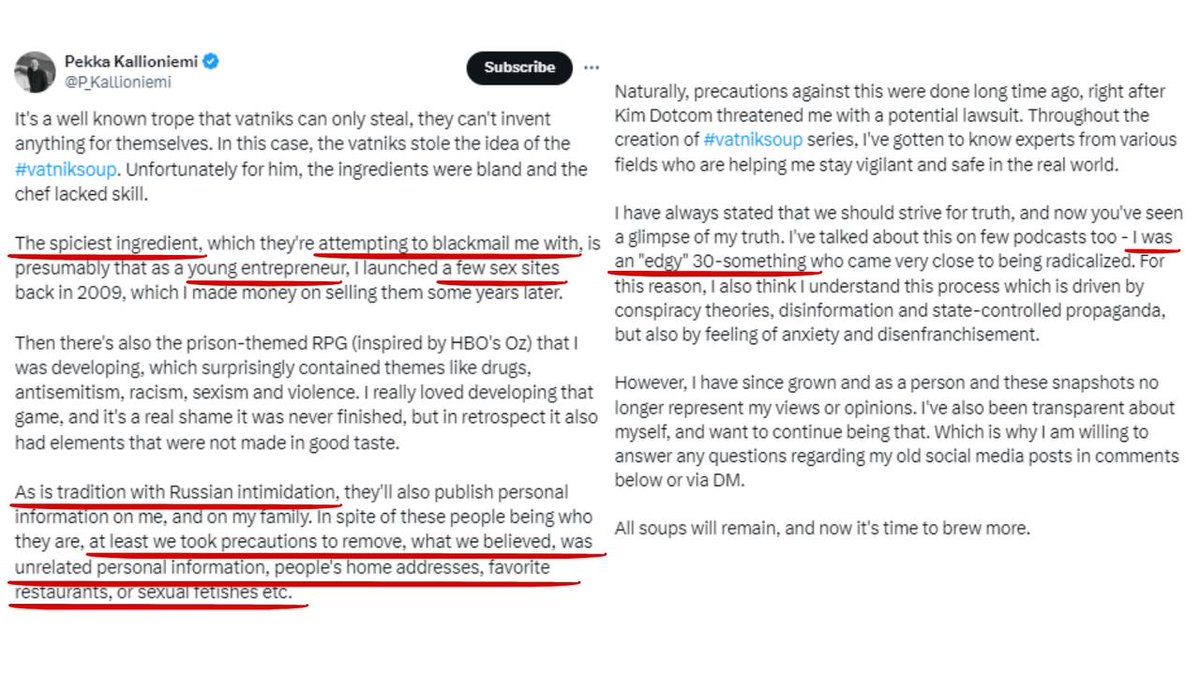 Pekka Kallioniemi (@p_kallioniemi), the “internet personality” who “created” the Vatnik Soup series and the self-professed Russian disinformation warrior, rose from relative obscurity to coveted subject matter expert and NAFO’s favorite poster boy within a relatively short time frame. Not one to let a great grift go to waste, even if it meant that he would ironically become a useful idiot himself, Pekka finally found the shortcut to achieving his purpose in life.