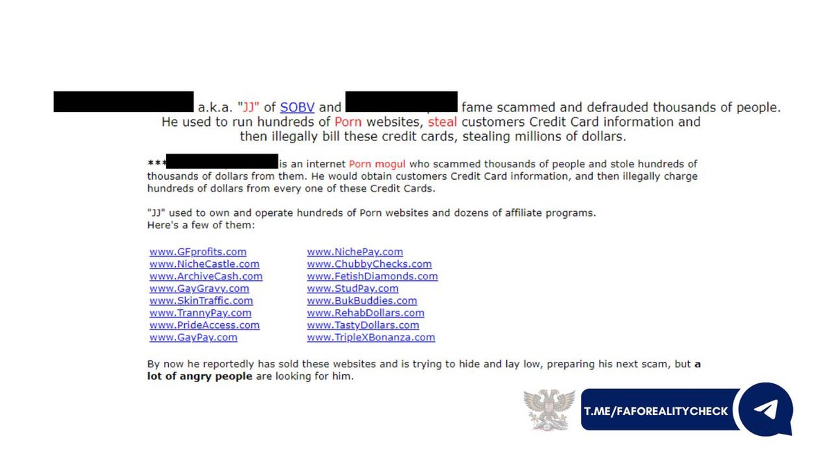 The real Jay in Kyiv was an adult entertainment marketer and porn peddler extraordinaire hailing from California. This JJ managed to scam countless affiliates out of the fees owed to them and created a convoluted labyrinth of shell companies across the globe so that the stolen money from his card-banging schemes would be impossible to locate. JJ pissed off enough people to have them purchase a domain in his name just so that they could share information (including super intimate details we can’t unsee) and curse his name and existence in a dedicated place, and this is just the tip of the iceberg. Only a small preview here.