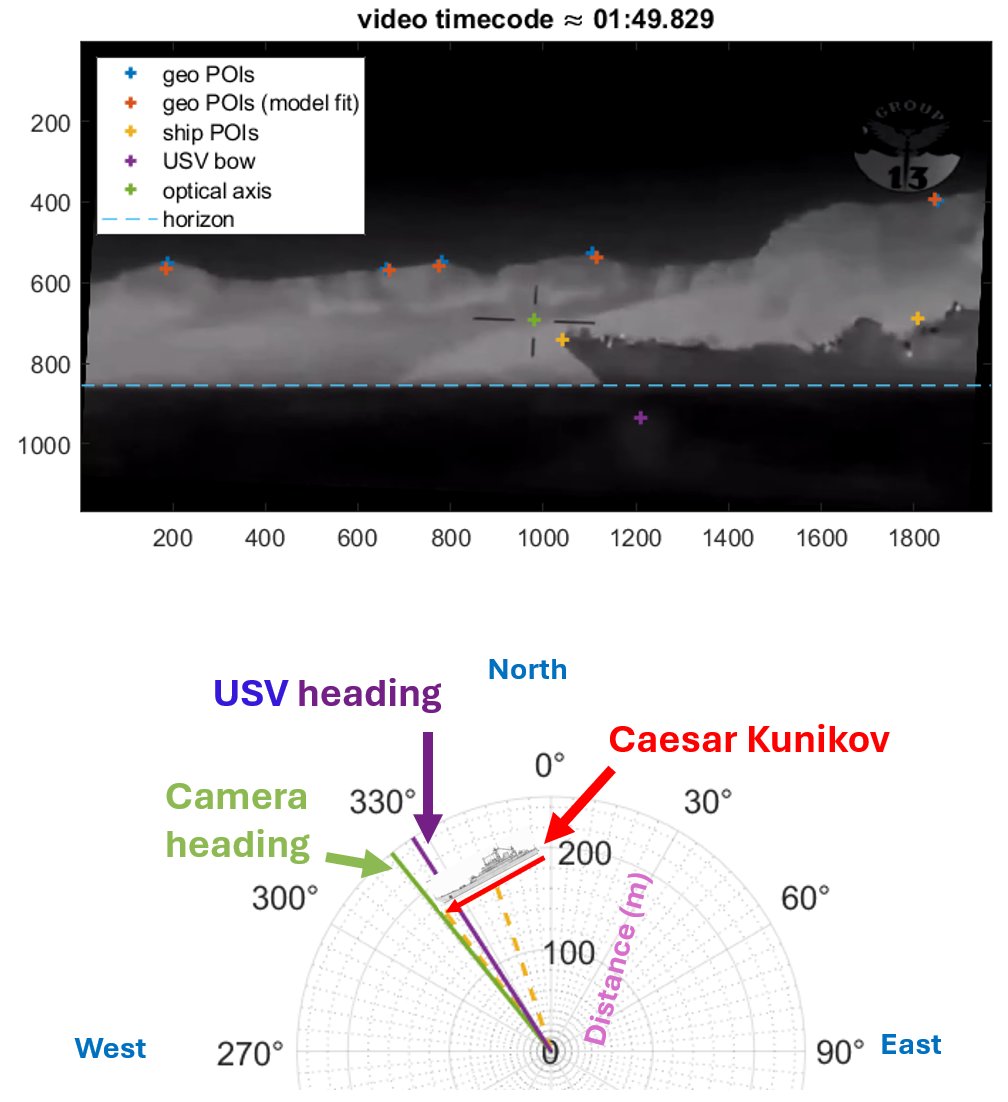 @GeoConfirmed Within the frames analyzed (around the video timecode 01:49.8) the USV is seen approaching Caesar Kunikov landing ship about 160-180 m away.