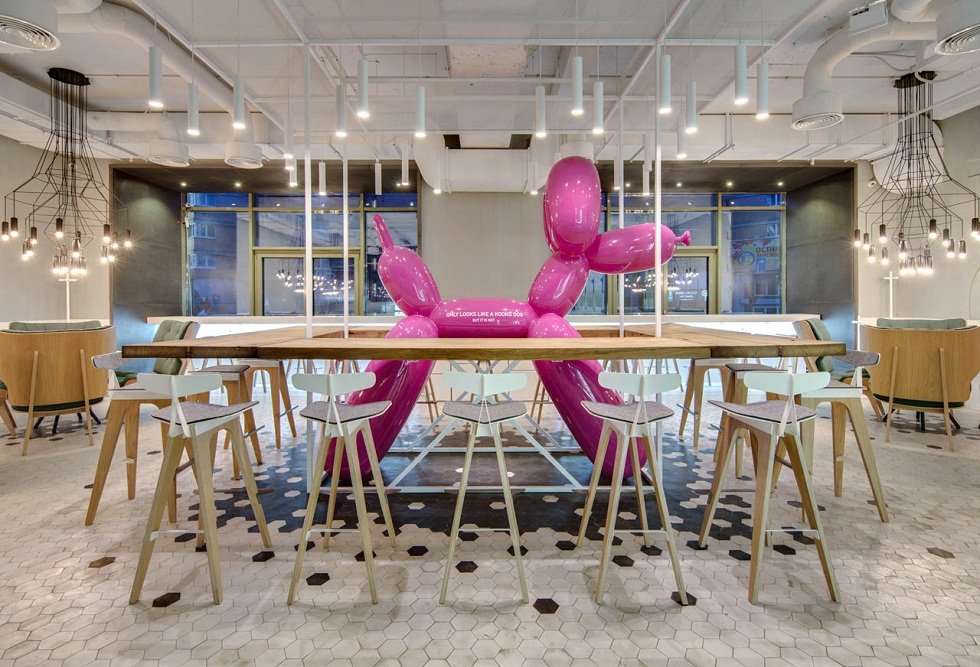 Featuring a cheeky imitation of a Jeff Koons' balloon animal sculpture, this café specializes in modern French patisserie and boasts an interior designed by 2b group, highlighted by a striking pink balloon-like dog sculpture against a backdrop of 10,000 unique handmade tiles, all crafted to resemble a glazed cake on a white plate.