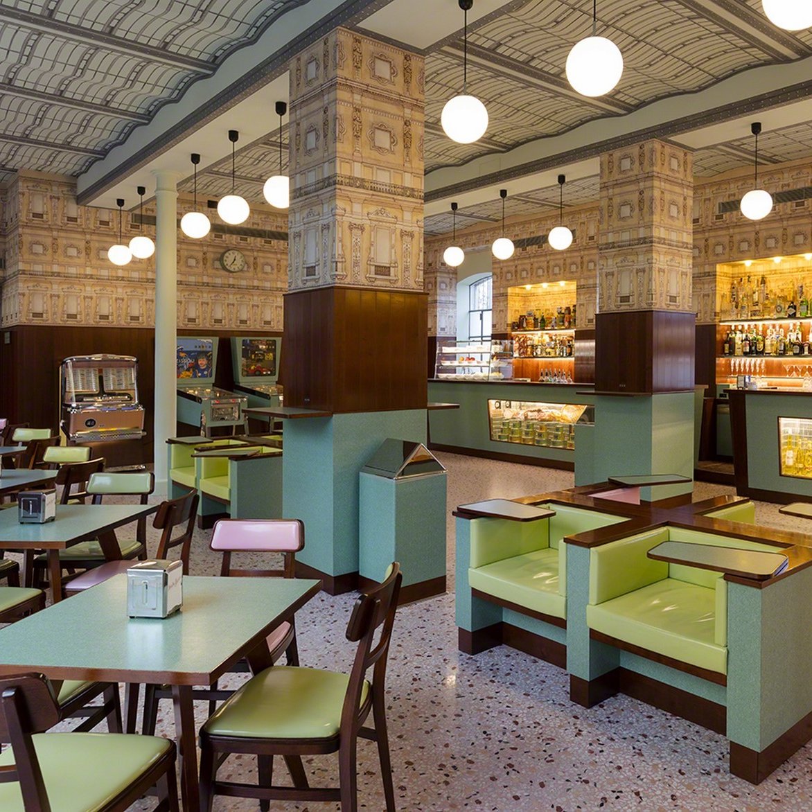 Designed by Wes Anderson, famous for its nostalgic atmosphere reminiscent of old Milanese cafes and cinematic design elements.