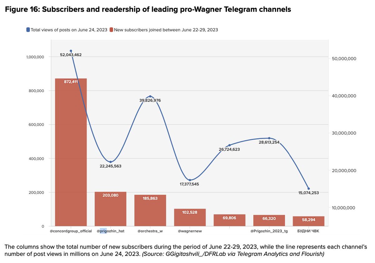 #Wagner-affiliated channels posed significant challenges to Kremlin narratives, especially during the 2023 mutiny. Prigozhin's channels alone saw massive spikes in subscribers and engagement.