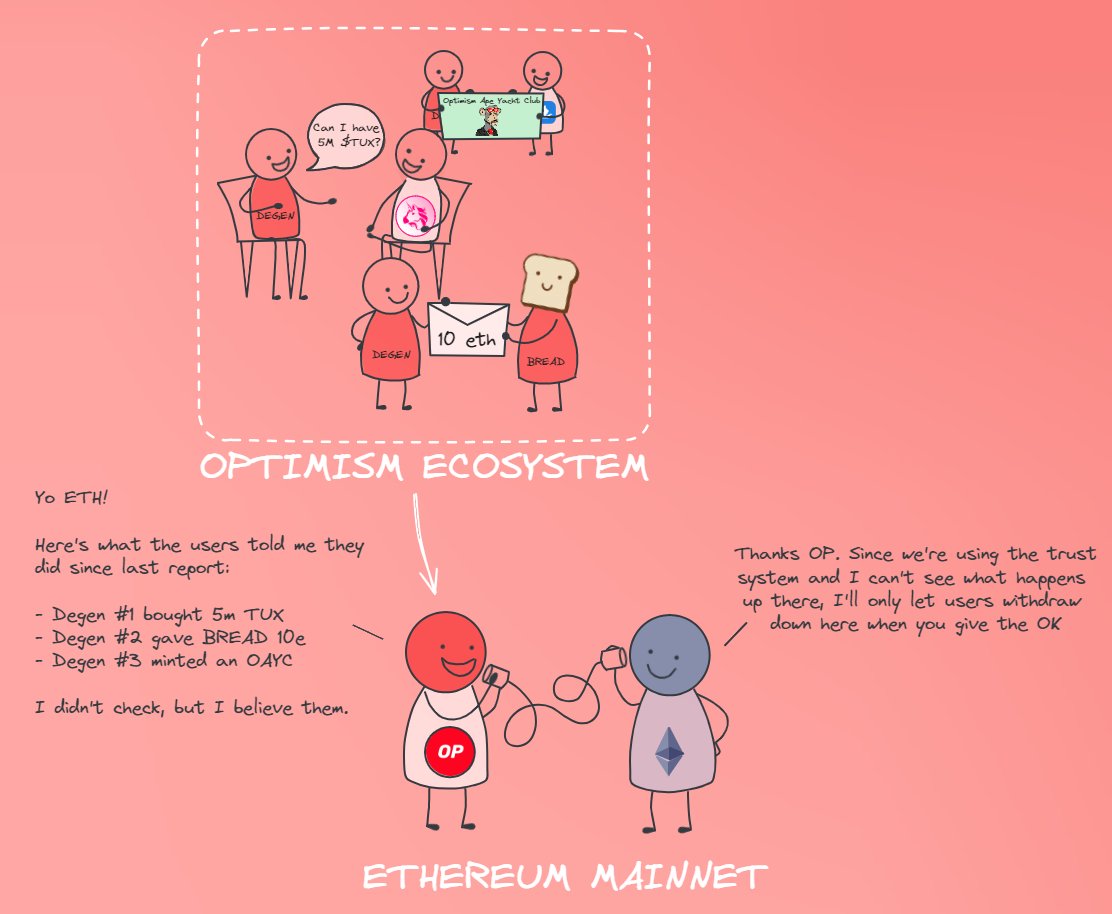 That's it: Optimism has armed users with the ability to prove when someone else is lying about what they own (and are attempting to move/withdraw). Given this ecosystem primitive, it means we can grant anyone withdrawal powers because others are incentivized to catch them and keep the system honest.