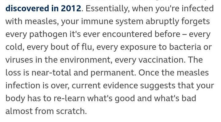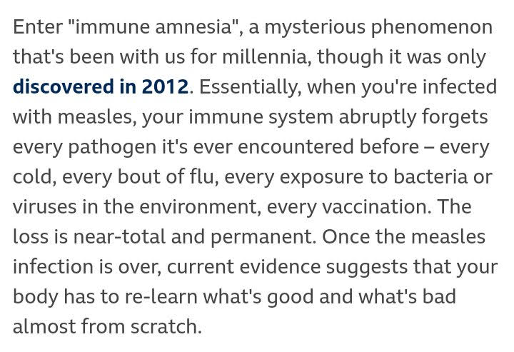 🚨Because, when you're infected with measles, your immune system abruptly forgets every pathogen it's ever encountered before – every cold, every bout of flu, every exposure to bacteria or viruses in the environment, every vaccination‼️ 1/
