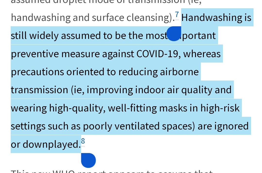 "Handwashing is still widely assumed to be the most important preventive measure against COVID-19, whereas precautions oriented to reducing airborne transmission (improving IAQ and wearing high-quality, well-fitting masks in high-risk settings) are ignored or downplayed."