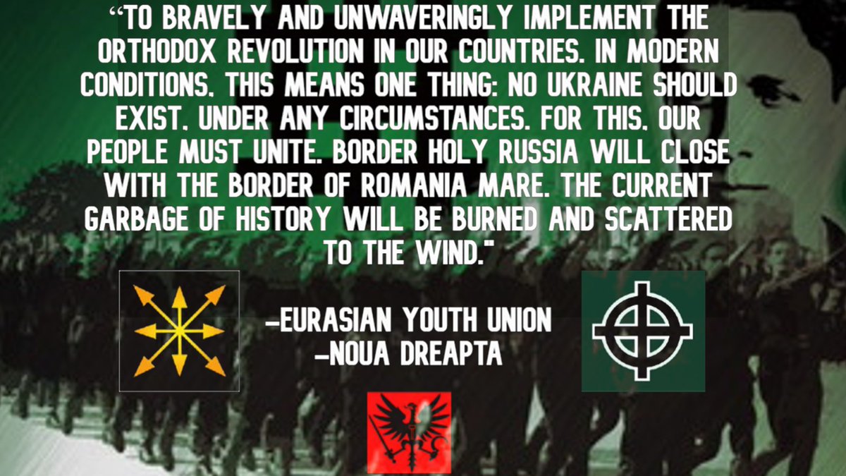 Codreanu is enormously popular with not only EYU but Russian nationalists in general. The irony they cry "Bandera" when they whitewash psychopaths like him. EYU & Dugin would even do a blood oath with Noua Dreapta at the tomb of Codreanu calling for the extinction of Ukrainians