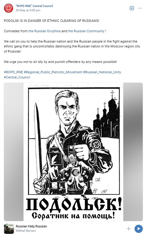 "Russin Nationalist" is another organization that organizes fight clubs & vigilantism, with the main goal of beating up Muslims, Africans & anti immigration, which they blame on Jews & the West. They also support the war & mobilization 18/