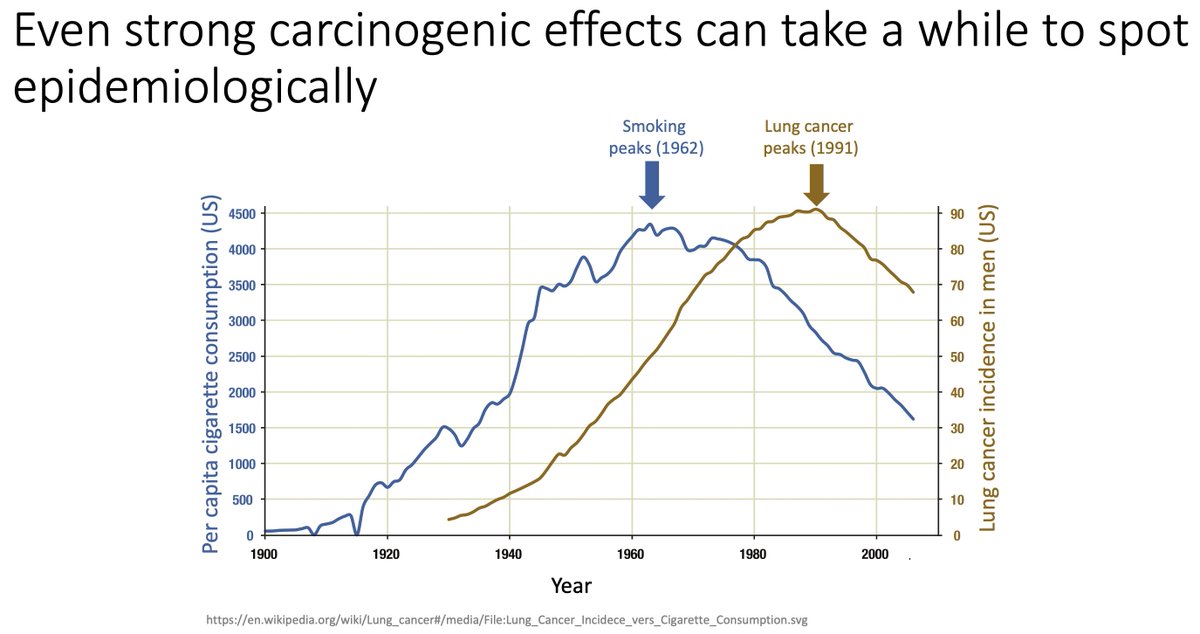 But, you say, if it's really a carcinogen, showing a rise in cancer rates should shut down the debate, right? It takes years for exposure to a carcinogen to lead to cancer. It'll likely be decades before the carcinogenic effects of Sc2 manifest in a rise in cancer rates. (10/)