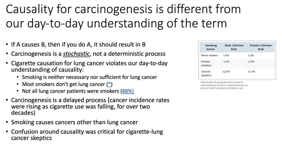Although cigarette smoking increases your risk of lung cancer 100x, it takes years of smoking. Most smokers don't die of lung cancer, nor are all lung cancer patients smokers. Despite strong associations, it was a long slog to establish cancer causation from epi data! (7/)