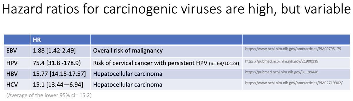 For viruses more broadly, while viral-attributed cancers are common, it has taken us decades to identify these associations. The presence of viral sequences doesnโt always track with cancers, & hazard ratios (HRs, a measure of relative increase in risk) can be very variable. (8/)