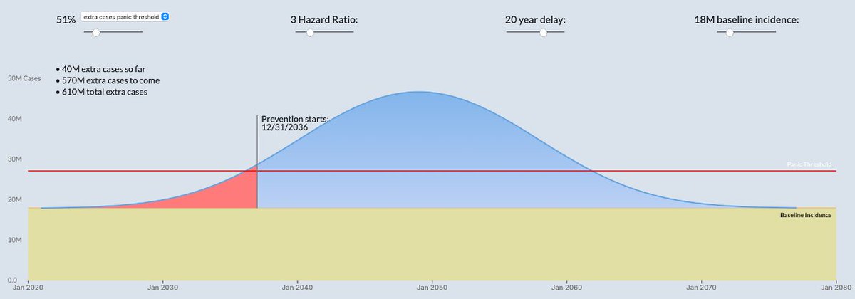 And let's assume that action is instantaneous & all future infections are halted on that day (12/31/2036). The red area (left) shows the number of cases above baseline. Baseline cancer cases worldwide are 18M/yr, so that gives us a total of 40M extra cases by that time. (14/)