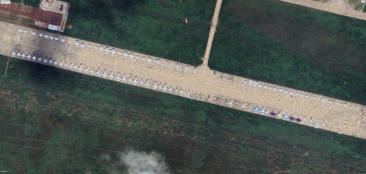In the imagery taken on 17 March 2022 we can see total of 15 Su-27 airframes (13 with old grey and 2 with three-tone splinter camo scheme). The photo was taken not long after first attacks on the base, if these Su-27s weren't evacuated all were likely not airworthy at that time.
