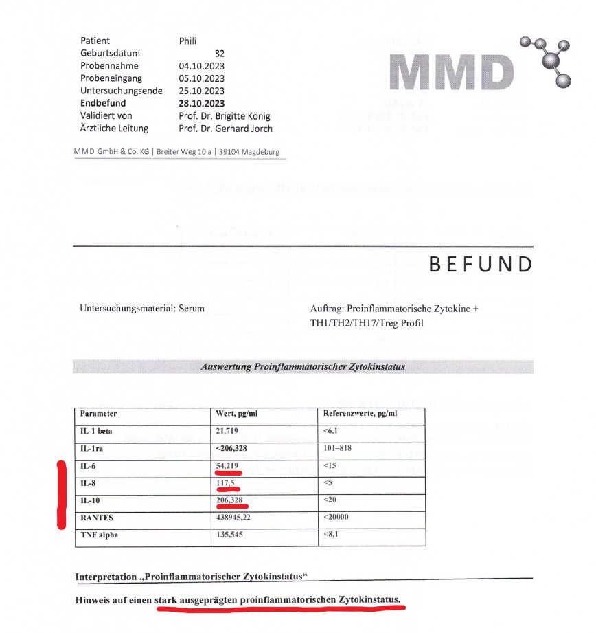 Im Oktober präsentierte die Uni Düsseldorf erstmals Biomarker des Blutes, mit denen es möglich sein soll, #postvac etwa von #longcovid zu unterscheiden. Die besagten Entzündungswerte - vor allem Interleukine IL6 und IL8 - sind bei mir weiterhin stark erhöht, bis um den Faktor 20. Das Labor spricht von einem "stark ausgeprägten proinflammatorischen Zytokinstatus".