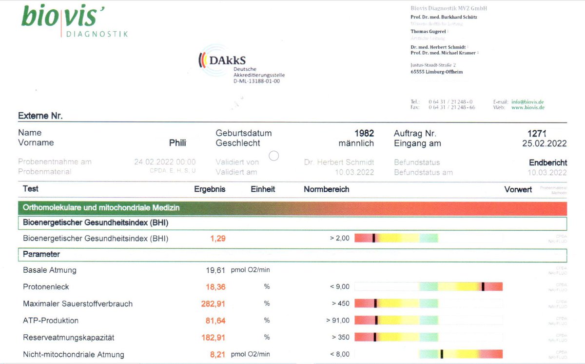 Da in den Kommentaren einige Fragen zum BHI kamen stelle ich hier zur Info nochmal die originale Erläuterung von Biovis zum "Bioenergetischen Gesundheitsindex" rein. Ein Wert von 1,29 bedeutet eine "stark erniedrigte" Mitochondrienfunktion. Therapiedauer von "mindestens 1 Jahr".