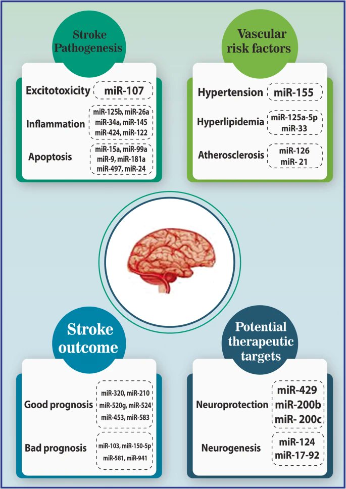 ⬇️miR-24, MiR-497, miR-15a/16-1, miR-181a and miR-106b-5p or ⬆️miR-210 and miR-124 <⬆️ antiapoptotic proteins (Bcl-w, Bcl-2, Bcl- xl) <⬇️ the size of the infarct in the ischemic brain