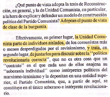 En primer lugar, el prisma de la Reconstrucción adopta el punto de vista individualista y contractualista burgués; el revisionismo generó la desorganización de los comunistas, por tanto éstos habrán de juntarse en aras de la firma del contrato de “unidad comunista”.