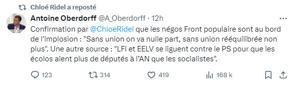 13/06/24, 11h48 : Antoine Oberdorff journaliste au Point, tweete à plusieurs reprises que les négociations sont au BORD de l'implosion, que Chloé Ridel, porte-parole du PS, lui confirme la difficulté des négociations. Elle retweete Oberdorff dans la foulée.