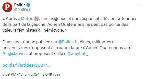 18h29 : Politis publie une tribune signée par de nombreuses féministes exigeant qu'Adrien Quatennens ne se présente pas et qu'Amy Bah, militante de Nous Toutes, prenne sa place.