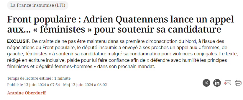 A noter que cette tribune se faisait en réaction à un appel d'Adrien Quatennens aux féministes, dévoilée par....Antoine Oberdorff dans l'Opinion à 7h54. 👽