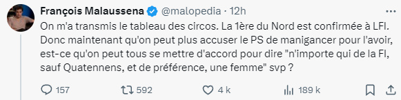 François Malaussena, GRAND analyste de la politique et éminent homme de gauche, tweete qu'il faut absolument destituer Quatennens. Nous confirme que le PS n'a RIEN à voir avec cette histoire et que les gens qui penseraient le contraire seraient bien "mal informés".