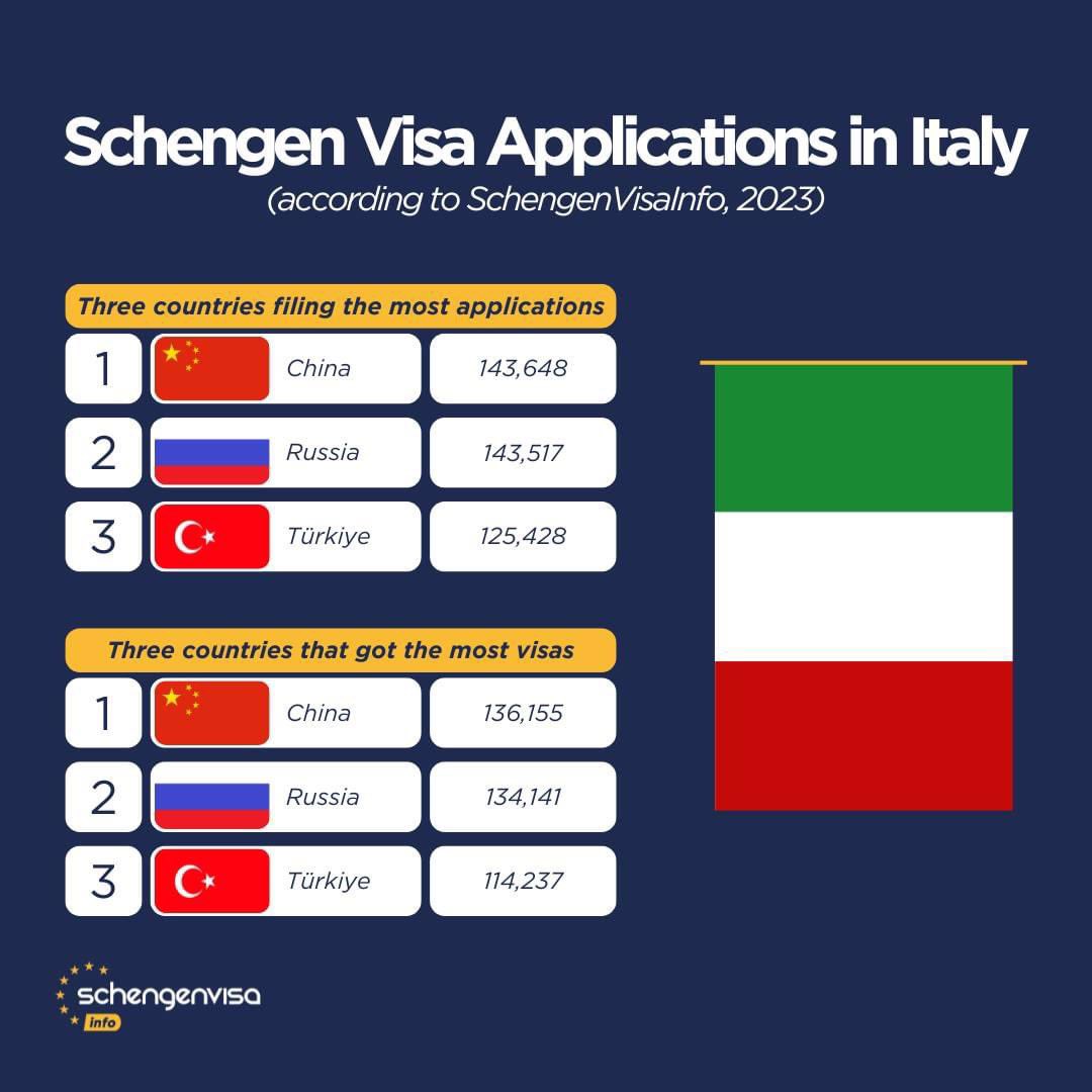 Italy received 1,108,035 Schengen visa applications in 2023. Who were the main applicants and recipients of visas - russians and Chinese.