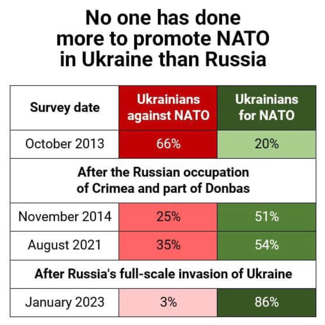 2/ Until 2013, only about 20-30% of Ukrainians (depending on the poll) were in favor of joining NATO. After the annexation of Crimea, that number went up to more than 50%. And now, after the full scale invasion, close to 90% of Ukrainians say that they want Ukraine to join NATO.