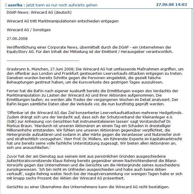 "In Deutschland hegen Finanzaufsicht und Staatsanwaltschaft den Verdacht, dass Marktteilnehmer mit den Vorwürfen den Aktienkurs vorsätzlich manipuliert haben. Deshalb hat die Finanzaufsicht BaFin bei Wirecad so genannte Leerverkäufe verboten."
