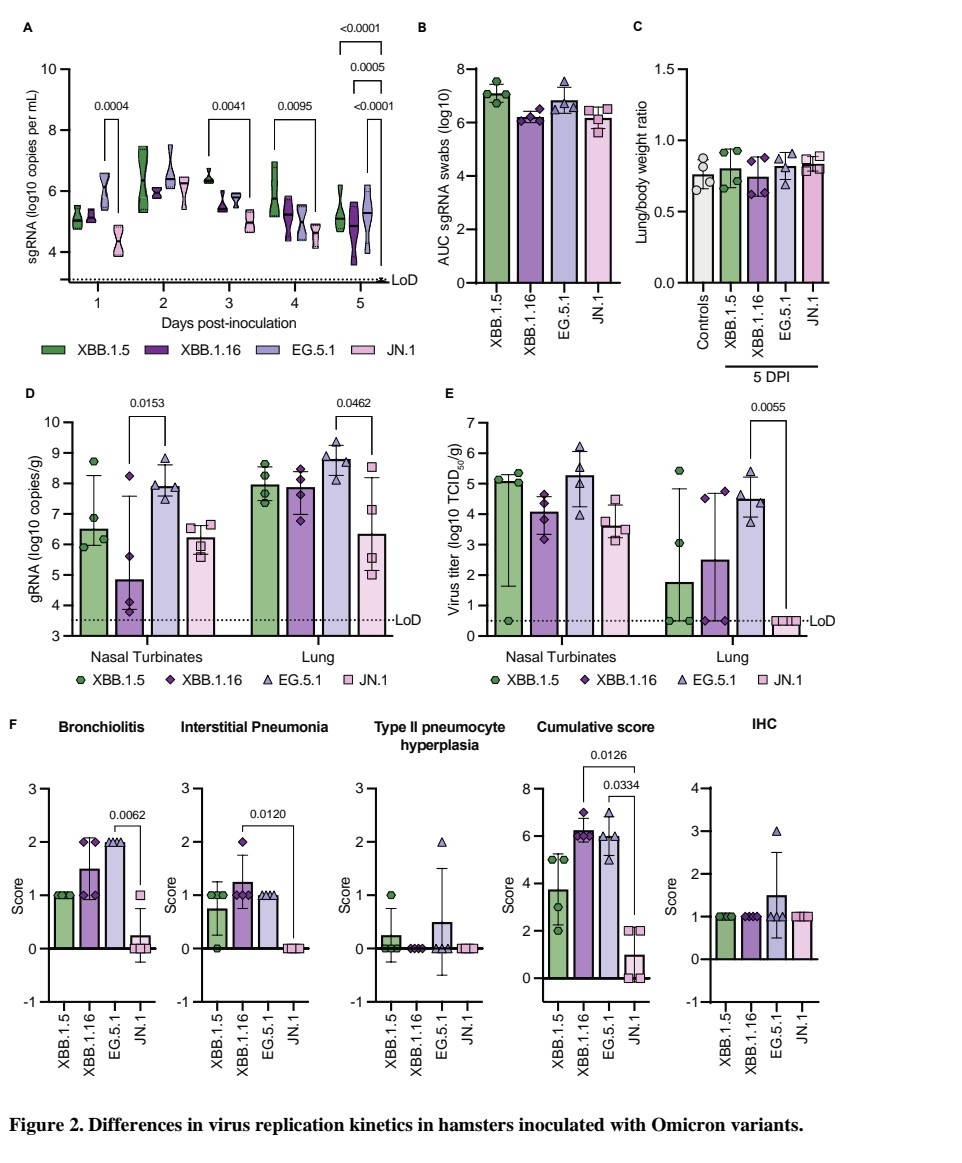 2) The study examined the phenotypic characteristics of four contemporary Omicron variants (XBB.1.5, XBB.1.16, EG.5.1, and JN.1) in terms of pathogenicity, transmissibility, and species susceptibility. The researchers found that ...