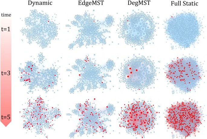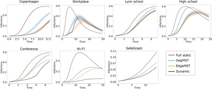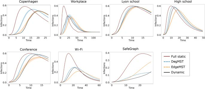 3) The standard approach of collapsing all temporal edges into a full static graph often leads to overestimation of disease spread, as it fails to capture the sparsity of real-world contact networks. In contrast, EdgeMST and DegMST are designed to preserve the network sparsity ..