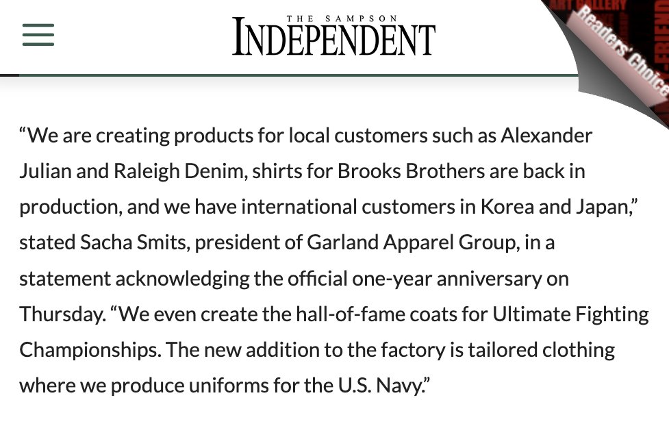Out of this rubble was a small beam of hope: the emergence of the Garland Apparel Group, which sought to rescue the operation. They bought the factory and brought back many of the employees—109 out of the 150. In 2022, Sampson Independent said business was "bursting at the seams"