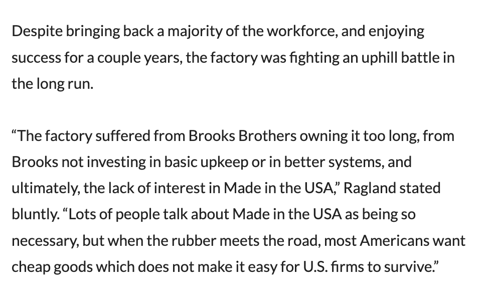 Kenneth Ragland, the managing partner for Garland Apparel Group, told the newspaper bluntly: “Lots of people talk about Made in the USA as being so necessary, but when the rubber meets the road, most Americans want cheap goods, which do not make it easy for US firms to survive.”