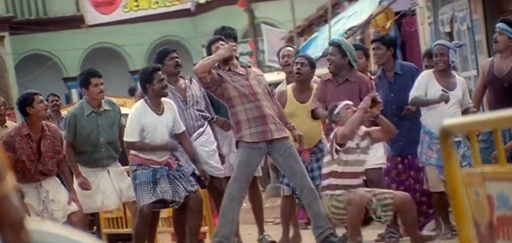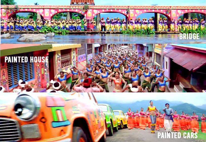 For the folkish "Andankaka Kondakari" song, #Shankar transformed a village near Tenkasi by painting all 350 houses, roads, rocks, and a bridge in various colors with the help of art director Sabu Cyril. They also adorned hundreds of lorries and old model Ambassador cars with painted faces, costing approximately Rs. 1 crore at that time.