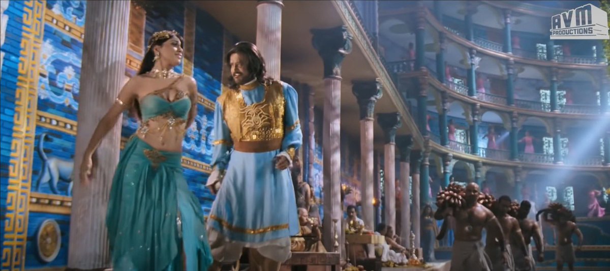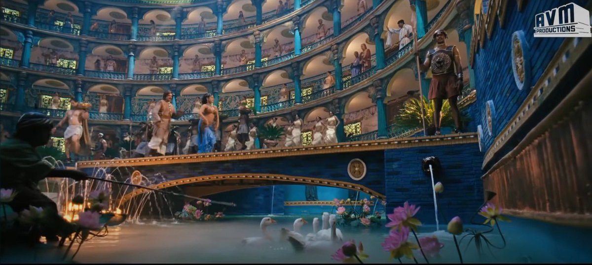 For "Vaaji Vaaji," art director #ThottaTharani built a four-story Babylonian palace in 30 days at Ramoji Rao Film City, featuring 80 to 100 dancers. #KVAnand, filming with Super 35 mm, faced challenges in lighting the massive set. The single song cost ₹3.5 crore. "Vaaji Vaaji" exemplifies Shankar's grand vision.