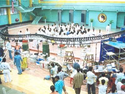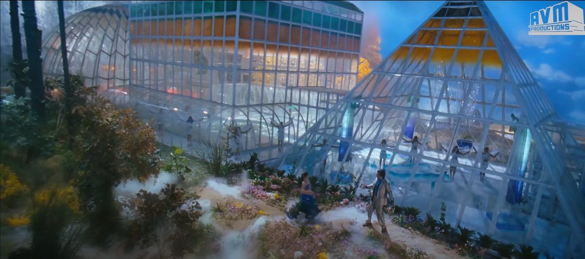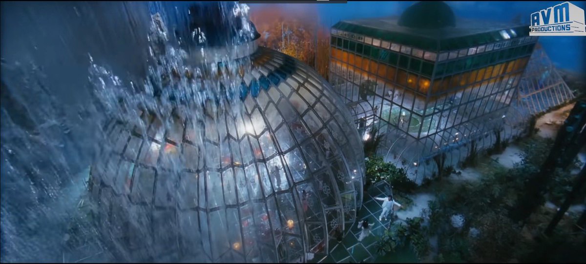 The domes were in square, circular, and pyramid shapes, with water falling from a height of 50 meters. They used acrylic and normal glass for construction, and it took 30 days to build. DOP #KVAnand faced a challenging task in providing proper lighting with the glass elements. He was on sets for 3 days planning how to light the glass house.