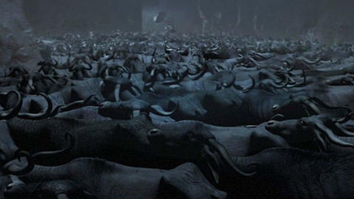 The scene depicting hundreds of buffaloes chasing and trampling a car owner to death in an abandoned sand quarry was achieved using CGI, with only one buffalo involved. The CGI work was handled by Jayakumar and V. Srinivas Mohan from the Chennai-based firm, Indian Artists Computer Graphics.