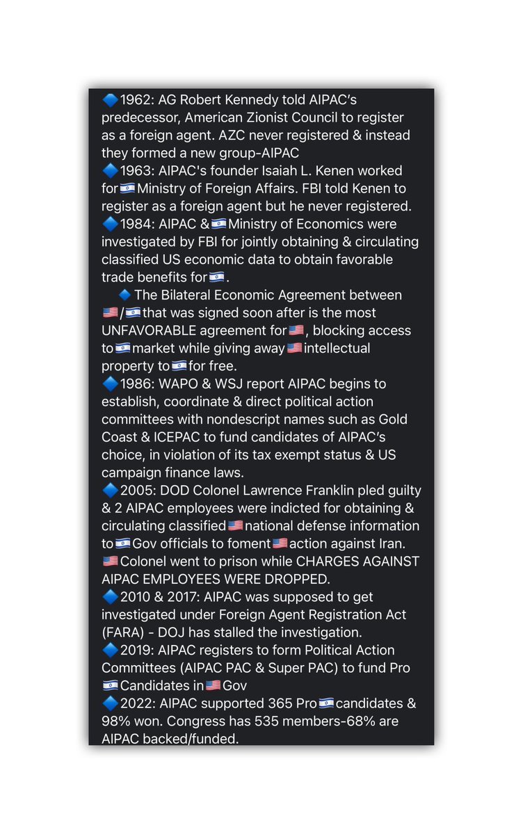 AIPAC has been investigated for foreign agent registration as far back as 1962 when AG Robert Kennedy told AIPAC’s predecessor AZC to register under FARA. AIPAC was also investigated for ESPIONAGE yet, nothing ever happens.👇🏼