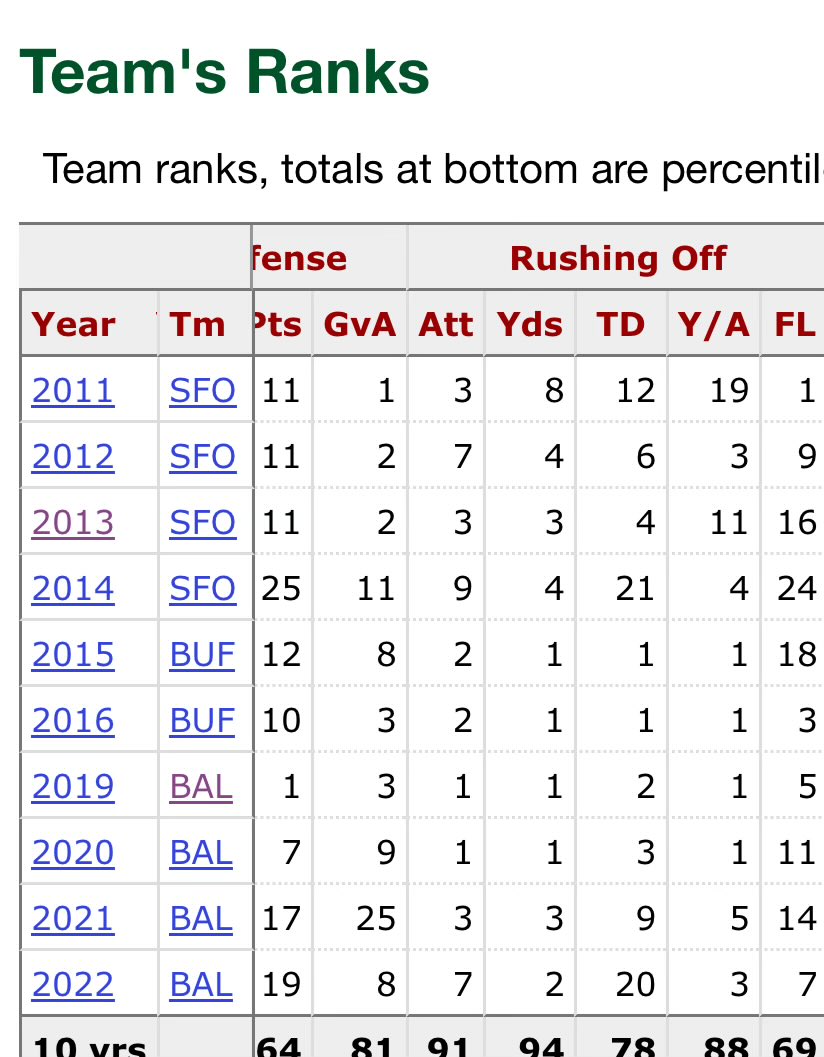 In addition, Greg Roman has been an offensive coordinator since 2011 and *never* ranked outside the top 9 teams in the whole league in rush attempts OR yards.