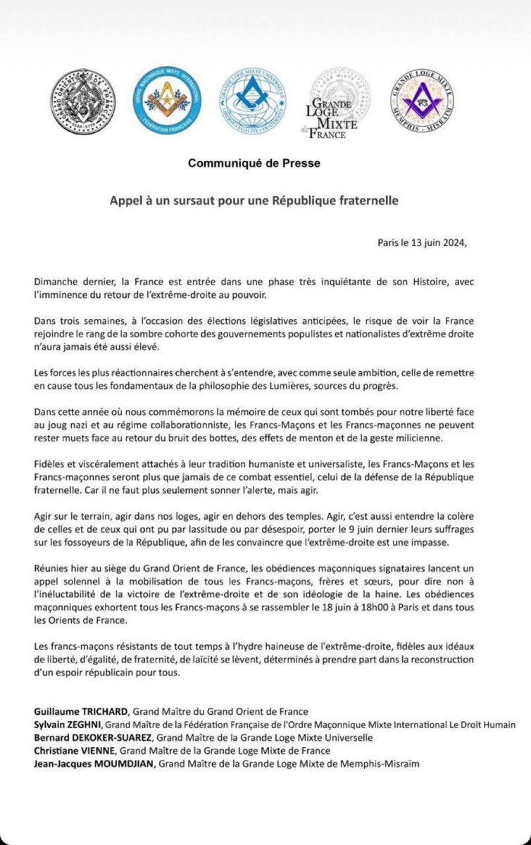 La Masonería se pone en contra de Le Pen y por consiguiente a favor de ese proyecto criminal del Globalismo alentado por los Anglos 20minutos.es/noticia/521316…