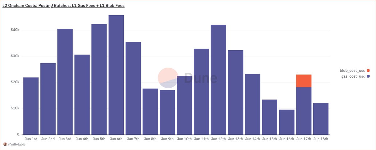 Usually, blob fees are tiny, and gas is the majority of the cost. Yesterday, however, blob fees skyrocketed and made up 21% of L2 batch posting costs that day.