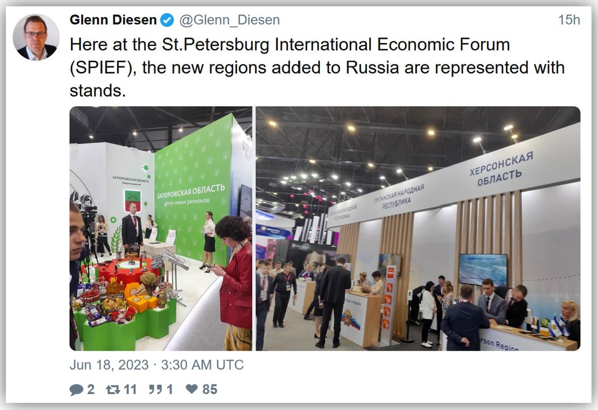 18. juni 2023 så man samme mønster - da Diesen igjen besøkte SPIEF. Da tvitret han ikke at Russland hadde «annektert» fire nye regioner i Ukraina, nei, han skrev at de «ble lagt til Russland» og de var «representert» på SPIEF. Altså: Hvitvasking av Putins angrepskrig. 10/15