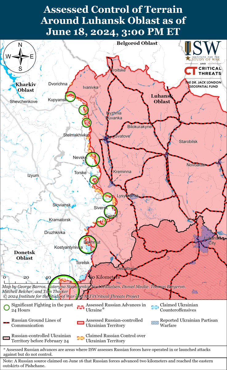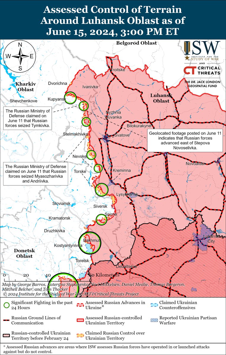 2/ Russian forces recently marginally advanced west of Kreminna. Geolocated footage published on June 18 indicates that Russian forces recently marginally advanced northeast of Torske (west of Kreminna).
