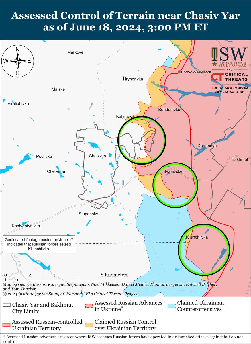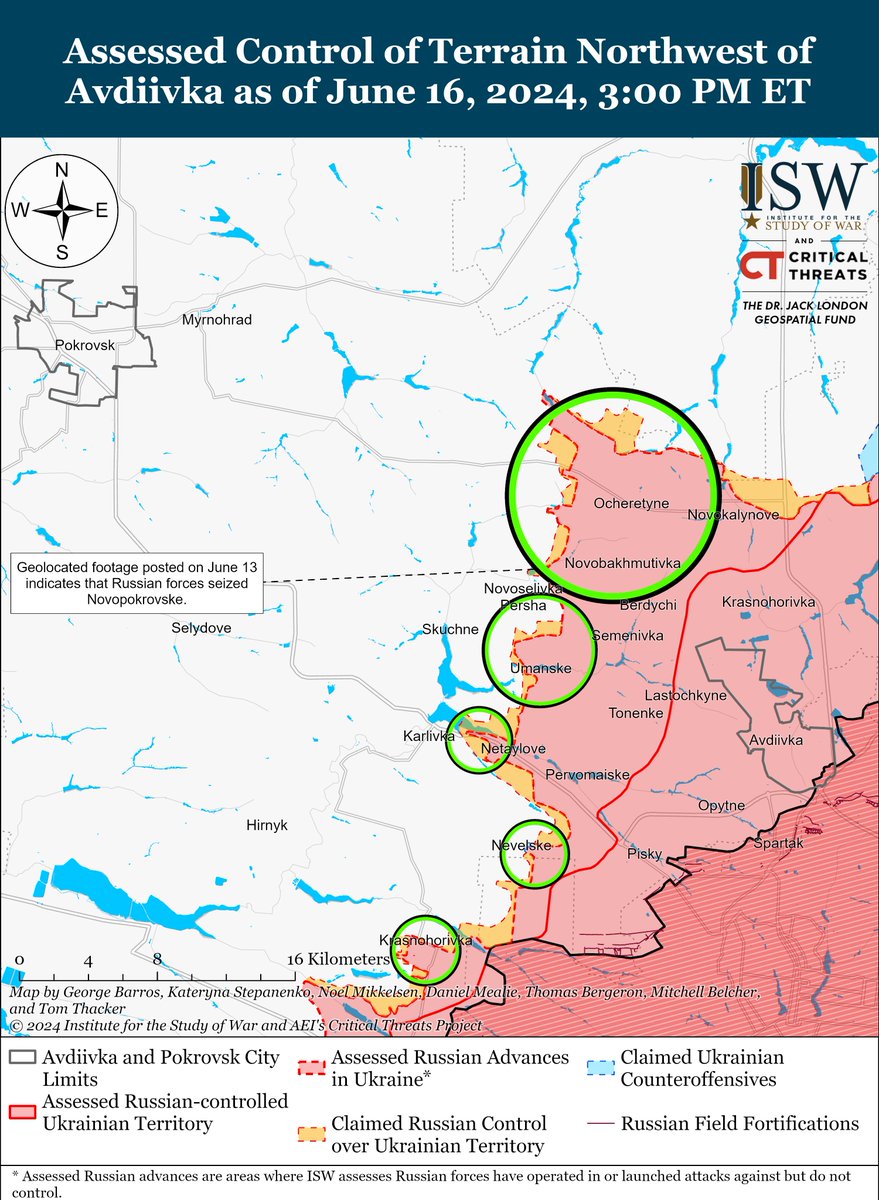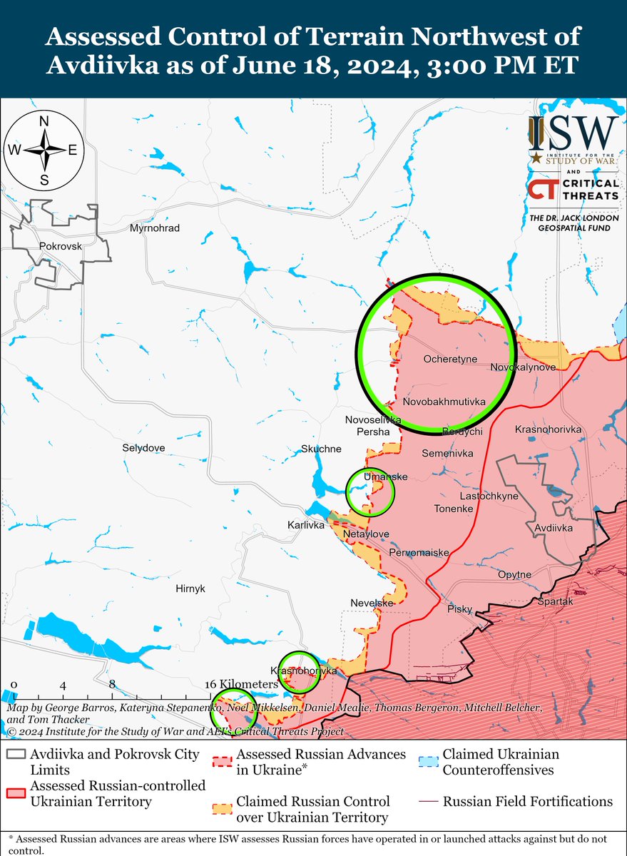 4/ Russian forces recently advanced northwest and west of Avdiivka amid continued ground attacks in the area on June 18. Geolocated footage published on June 18 shows that Russian forces advanced north of Sokil (northwest of Avdiivka), and a Russian milblogger claimed that Russian forces advanced even farther north of the settlement. Additional geolocated footage published on June 17 and 18 shows that Russian forces also advanced in fields approaching the eastern outskirts of Yasnobrodivka (west of Avdiivka).
