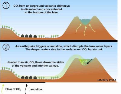 Esto no supondría ningún peligro de no ser porque el lago está directamente por encima de un respiradero volcánico que ha ido teniendo fugas de dióxido de carbono en el suelo de la cuenca del lago.