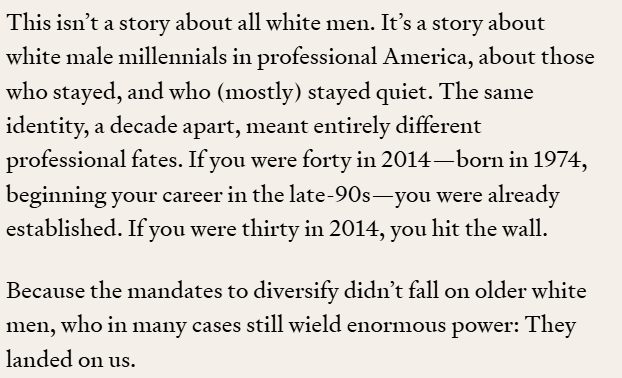 Prospects for *top talent* who identified as something other than a neurotypical, able-bodied straight white man were great. There was intense competition for most of the top "diverse" prospects. But most people who aspire to jobs at the New York Times or tenure-line academic positions don't get them. That was true in this period for blacks, for women, for queer folks, and so on. If you went to a middling school, didn't come from privilege, didn't have connections, didn't have a long record of illustrious accomplishments, the chances are terrible no matter who you are.