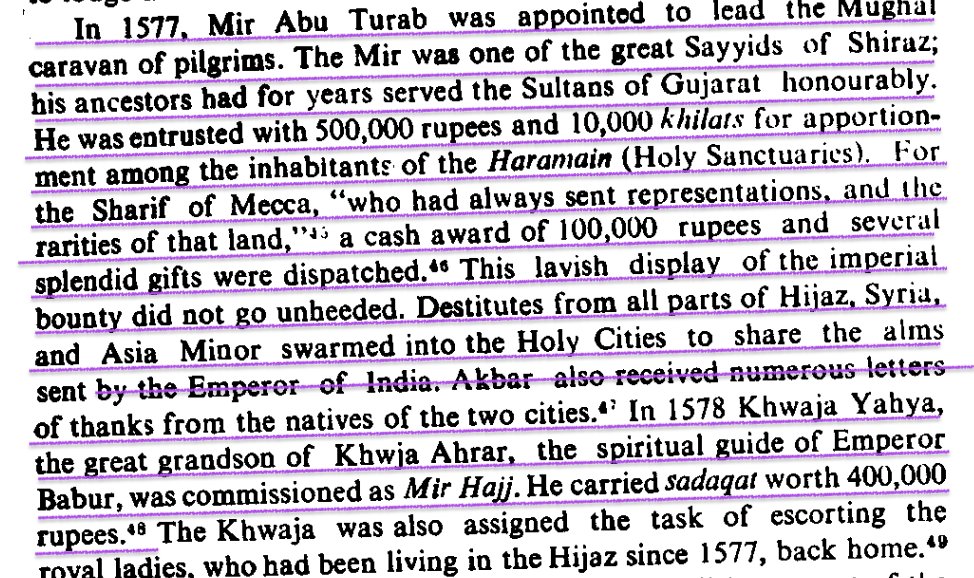 In 1577, Akbar sent Rs. 500,000 Rupees & 10,000 Khilats to distribute in Mecca. Another Rs. 100,000 & costly gifts for the Sharif of Mecca. In 1578, Rs. 400,000 were sent. Meanwhile desperate starving Indians turned to cannibalism while reeling from 2 huge famines under Akbar.