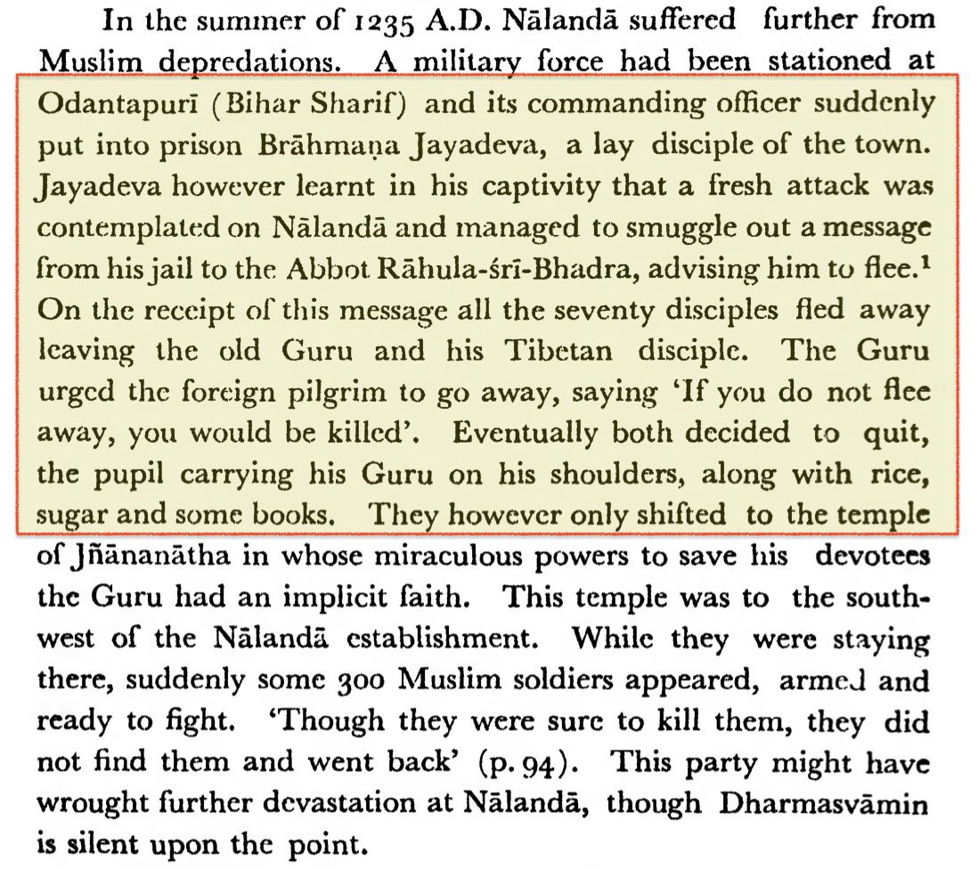 The fact that Brahmanas constantly helped Buddhists is further corroborated by Tibetan Buddhist monk Dharmasvamin (1235 AD) who visited Nalanda & Bihar a few decades after Khalji had destroyed Nalanda & other Buddhist Viharas of Magadha. He describes Hindus giving alms to Buddhist monks & a Brahmana named Jayadeva saving the last Buddhist abbot of Nalanda, Rahul’s Sri Bhadra from a Muslim attack