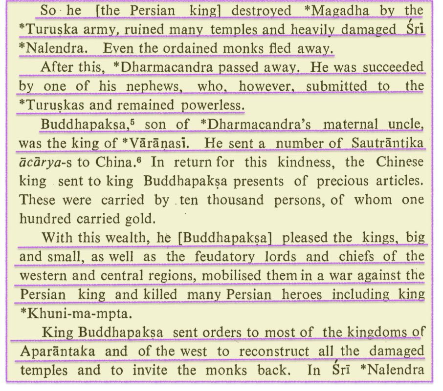 “The Persian king destroyed Magadha by the Turușka army, RUINED many temples & HEAVILY DAMAGED Sri Nalendra (Nalanda)”