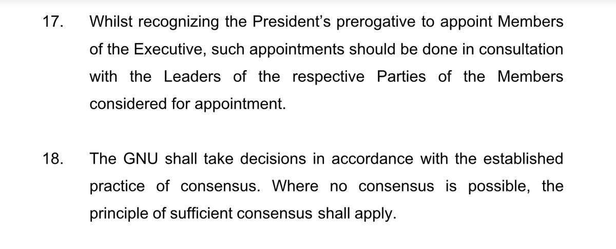 19. The agreement establishes a GNU Consultations Council responsible for consultations and monitoring the progress of the government, its resourcing, and implementation mechanisms. This is unconstitutional. Again, checks and balances are vested in Parliament, not a quasi-body.